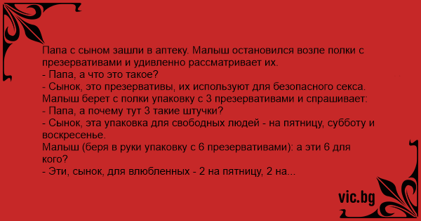 - Сынок, это презервативы, их используют для безопасного cekca. Малыш берет с полки упаковку с 3 презервативами и спрашивает: