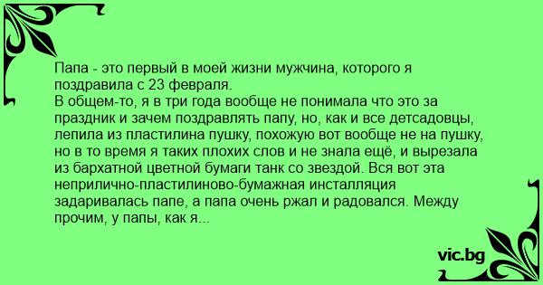 И к чему я вот сейчас всё это вам рассказываю? Да потому что для меня праздник 23 февраля никогда не был связан с вооружёнными силами, армией, защитой отечества и так далее. Это всегда был такой вот день, когда было принято поздравлять папу. Дарить ему пушки, смахивающие на фимозную гениталию, просить не умирать от старости в 28 лет, ходить с ним в пивнушку за чебуреком, и прощать ему Вия и куриную лапу. Поэтому все мужики, у которых сейчас есть свои дочки – знайте: это ваш праздник. Вне зависимости от того: служили вы или нет. Для ваших дочек – это День Папы!