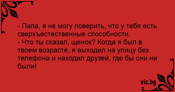 - Папа, я не могу поверить, что у тебя есть сверхъестественные способности.<br />- Что ты сказал, щенок? Когда я был в твоем возрасте, я выходил на улицу без телефона и находил друзей, где бы они ни были!