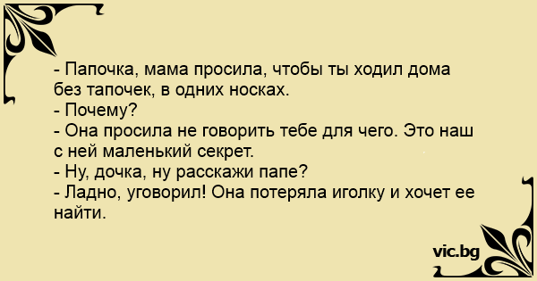 - Папочка, мама просила, чтобы ты ходил дома без тапочек, в одних носках.