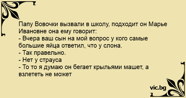 Вертається Вовочка з школи з двойкою. Батько питає: — За що? — А на біології училка питала, в кого найбільші яйця. — Ну? — Я кажу — в слона. А вона мені — ні, в страуса. — Ніііі сину... Таки в...