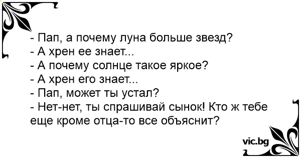 - Тато, а чому Місяць більше за зірки? - А кат його знає... - А чому Сонце таке яскраве? - А біс його знає... - Тато, може, ти втомився? - Ні-ні, ти питай, синку, питай! Хто ж тобі ще, окрім...