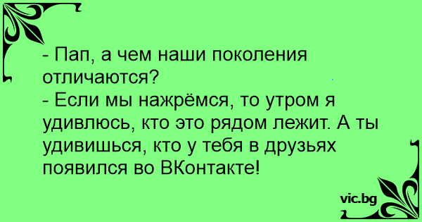 - Если мы нажрёмся, то утром я удивлюсь, кто это рядом лежит. А ты удивишься, кто у тебя в друзьях появился во ВКонтакте!