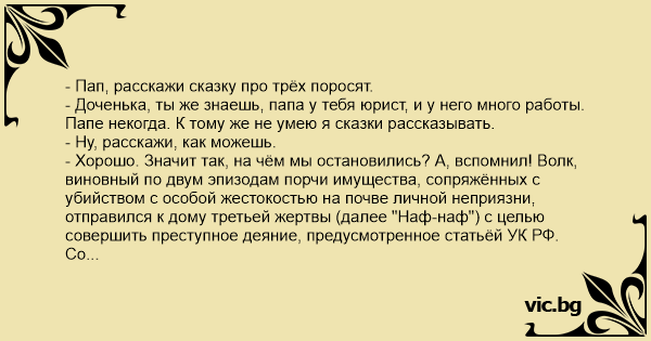- Пап, расскажи сказку про трёх поросят. - Доченька, ты же знаешь, папа у тебя юрист, и у него много работы. Папе некогда. К тому же не умею я сказки рассказывать. - Ну, расскажи, как можешь. - Хорошо. Значит так, на чём мы остановились? А, вспомнил! Волк, виновный по двум эпизодам порчи имущества, сопряжённых с убийством с особой жестокостью на почве личной неприязни, отправился к дому третьей жертвы (далее "Наф-наф") с целью совершить преступное деяние, предусмотренное статьёй УК РФ. Со своей стороны лицо, именуемое "Наф-наф", предприняло действия, содержащие в себе состав преступления, предусмотренные статьёй УК РФ "Превышение пределов необходимой обороны". Вследствие чего подозреваемый (он же Волк) получил травмы, не совместимые с жизнью. В соответствии со статьёй 73 УПК РФ, а также, учитывая личность подозреваемого и положительные характеристики с места работы, "Наф-наф" получил 2 года условно и 10 дней на обжалование приговора.