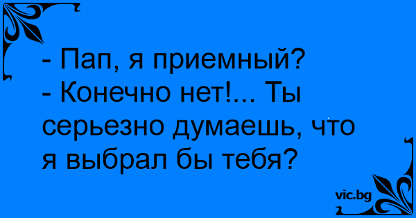 - Скажи, тато, я усиновлений? - Ти думаєш, якби ми з мамою могли вибрати дитину, ми взяли б такого дебіла?