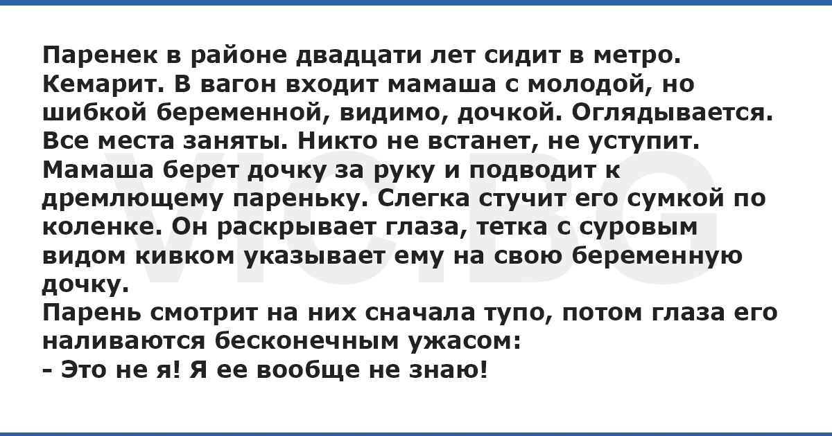 Паренек в районе двадцати лет сидит в метро. Кемарит. В вагон входит мамаша с молодой, но шибкой беременной, видимо, дочкой. Оглядывается. Все места заняты. Никто не встанет, не уступит. Мамаша берет дочку за руку и подводит к дремлющему пареньку. Слегка стучит его сумкой по коленке. Он раскрывает глаза, тетка с суровым видом кивком указывает ему на свою беременную дочку. Парень смотрит на них сначала тупо, потом глаза его наливаются бесконечным ужасом: - Это не я! Я ее вообще не знаю!