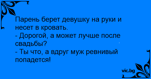 - Сеня, дорогой, а может, лучше после свадьбы? - Ты что? А вдруг тебе ревнивый муж попадется!