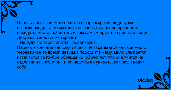 Парень, окончательно смутившись, возвращается на свое место. Через какое-то время девушка подходит к нему, мило улыбается, извиняется за грубое обращение, объясняет, что она учится на отделении психологии, и ей надо было увидеть, как люди ведут себя в подобной ситуации. А сейчас она будет рада выпить и поболтать с ним. На что парень громко кричит: