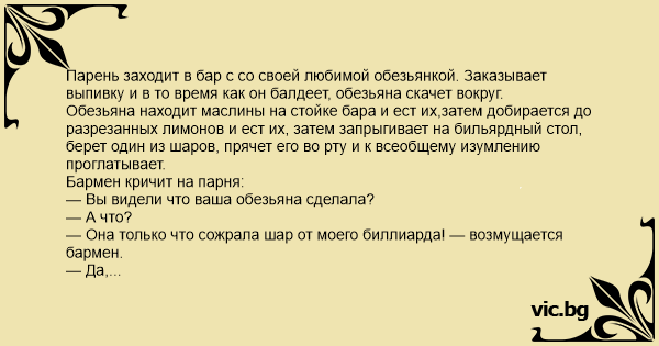 Парень заходит в бар с со своей любимой обезьянкой. Заказывает выпивку и в то время как он балдеет, обезьяна скачет вокруг.