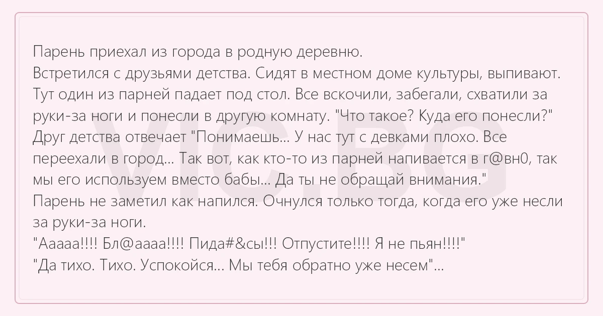 Встретился с друзьями детства. Сидят в местном доме культуры, выпивают. Тут один из парней падает под стол. Все вскочили, забегали, схватили за руки-за ноги и понесли в другую комнату. "Что такое? Куда его понесли?" Друг детства отвечает "Понимаешь... У нас тут с девками плохо. Все переехали в город... Так вот, как кто-то из парней напивается в г@вн0, так мы его используем вместо бабы... Да ты не обращай внимания."