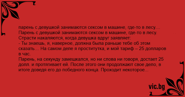 Парень, на секунду замешкался, но ни слова ни говоря, достает 25 долл. и протягивает ей. После этого они продолжают свое дело, в итоге доведя его до победного конца. Проходит некоторое время, а парень все сидит за рулем, уставившись в окно и не говоря ни слова. Девушка начинает нервничать.