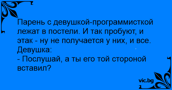 Парень с девушкой-программисткой лежат в постели. И так пробуют, и этак - ну не получается у них, и все.