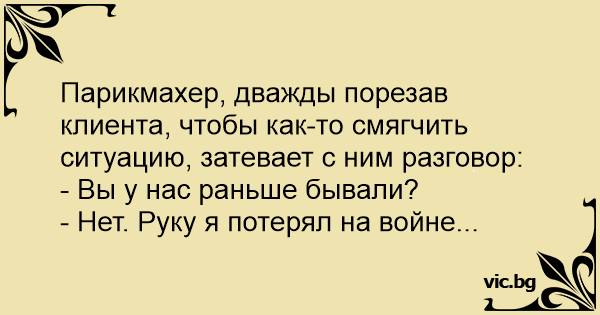 Парикмахер, дважды порезав клиента, чтобы как-то смягчить ситуацию, затевает с ним разговор: