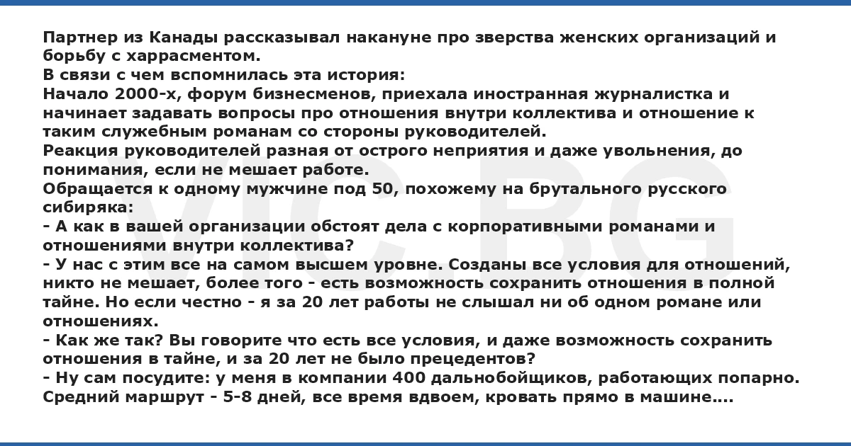 Партнер из Канады рассказывал накануне про зверства женских организаций и борьбу с харрасментом. В связи с чем вспомнилась эта история: Начало 2000-х, форум бизнесменов, приехала иностранная журналистка и начинает задавать вопросы про отношения внутри коллектива и отношение к таким служебным романам со стороны руководителей. Реакция руководителей разная от острого неприятия и даже увольнения, до понимания, если не мешает работе. Обращается к одному мужчине под 50, похожему на брутального русского сибиряка: - А как в вашей организации обстоят дела с корпоративными романами и отношениями внутри коллектива? - У нас с этим все на самом высшем уровне. Созданы все условия для отношений, никто не мешает, более того - есть возможность сохранить отношения в полной тайне. Но если честно - я за 20 лет работы не слышал ни об одном романе или отношениях. - Как же так? Вы говорите что есть все условия, и даже возможность сохранить отношения в тайне, и за 20 лет не было прецедентов? - Ну сам посудите: у меня в компании 400 дальнобойщиков, работающих попарно. Средний маршрут - 5-8 дней, все время вдвоем, кровать прямо в машине....