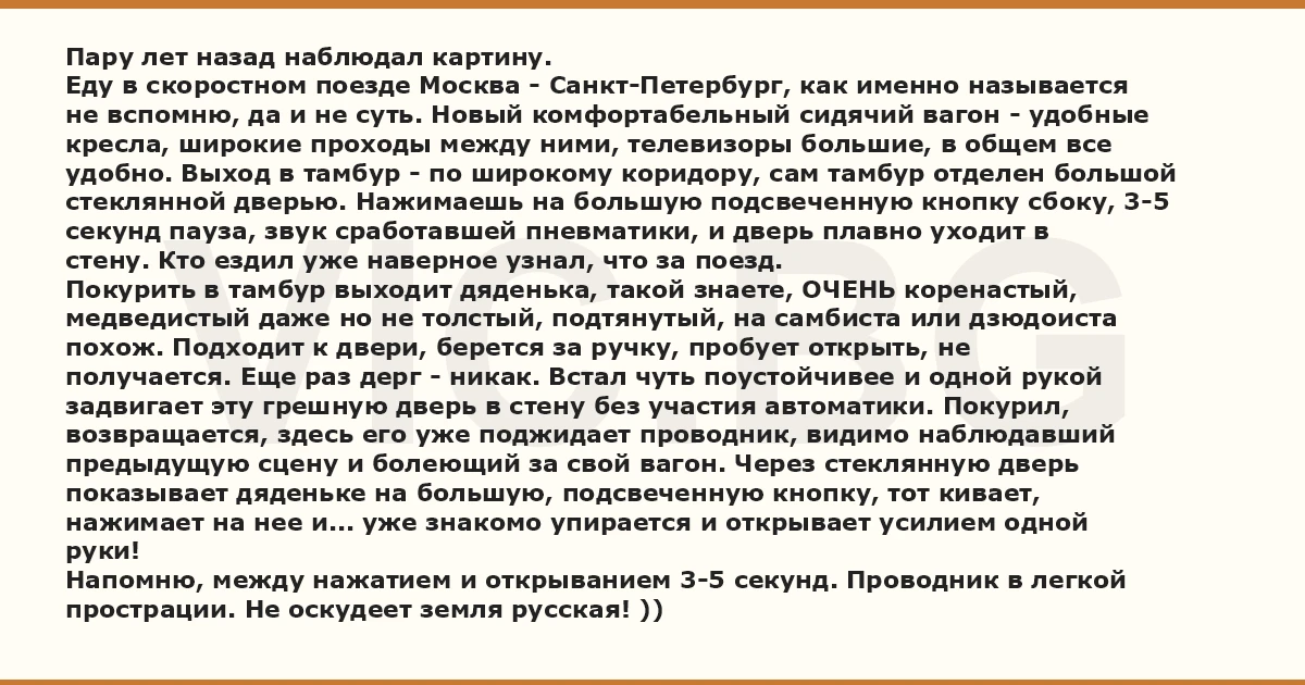 Покурить в тамбур выходит дяденька, такой знаете, ОЧЕНЬ коренастый,