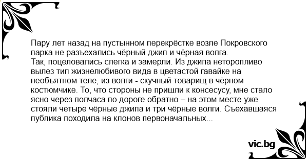 Пару лет назад на пустынном перекрёстке возле Покровского парка не разъехались чёрный джип и чёрная волга.