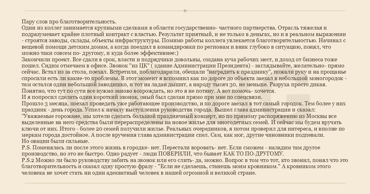 Пару слов про благотворительность. Один из коллег занимается крупными сделками в области государственно- частного партнерства. Отрасль тяжелая и подразумевает крайне плотный контракт с властью. Результат приятный, и не только в деньгах, но и в реальном выражении - строятся заводы, склады, объекты инфраструктуры. Помимо работы коллега увлекается благотворительностью. Начинал с вещевой помощи детским домам, а когда поездил в командировки по регионам и вник глубоко в ситуацию, понял, что можно таки совсем по- другому, и куда более эффективнее:) Закончили проект. Все сдали в срок, власти и подрядчики довольны, создана куча рабочих мест, и доход от бизнеса тоже пошел. Сидим отмечаем в офисе. Звонок "из ЦК" ( здание Администрации Президента) - заглядывайте, желательно- прямо сейчас. Встал из за стола, поехал. Встретили, поблагодарили, обещали "наградить к празднику", пожали руку и на прощанье спросили есть ли какие-то проблемы. В этот момент я вспомнил как по дороге до объекта заехал в небольшой моногородок - там остался один небольшой заводишко, и тот на ладан дышит, а народу тысяч 30, не меньше. Разруха просто дикая. Понятно, что тут по сути все нужно заново возрождать, но это я не потяну. А вот помочь- хочется. И я попросил сделать один короткий звонок, оный был сделан прямо при мне по спецсвязи. Прошло 3 месяца, поехал проведать уже работающее производство, и по дороге заехал в тот самый городок. Тем более у них праздник - день города. Успел к началу выступления руководства города. Вышел глава администрации и сказал: "Уважаемые горожане, мы хотели сделать большой праздничный концерт, но по прямому распоряжению из Москвы все выделенные на него средства были перераспределены на новое жилье для многодетных семей. И сейчас мы будем вручать ключи от них. Итого - более 20 семей получили жилье. Реальных очередников, я потом проверил для интереса, и вполне по меркам города достойное. А после вручения глава администрации спел. Сам, как мог, другие чиновники подпевали. Но овации были сильные. P.S. Поменялась ли после этого жизнь в городке- нет. Перестали воровать- нет. Если сможем - наладим там другое производство, но это не быстро. Одно радует - люди ПОВЕРИЛИ, что бывает КАК ТО ПО-ДРУГОМУ. P.S.2 Можно ли было руководству забить на звонок или его слить- да, можно. Вопрос в том что тот, кто звонил, понял что это благотворительность и сказал одну простую фразу - "Если не сделаешь, станешь моим кровником." А кровником этого человека не хочет стать ни один адекватный человек в нашей огромной и великой стране.