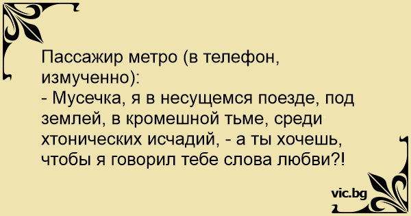- Мусечка, я в несущемся поезде, под землей, в кромешной тьме, среди хтонических исчадий, - а ты хочешь, чтобы я говорил тебе слова любви?!