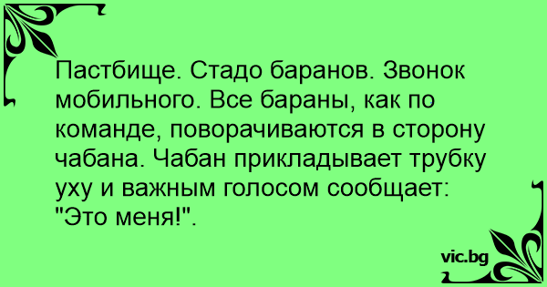 Пастбище. Стадо баранов. Звонок мобильного. Все бараны, как по команде, поворачиваются в сторону чабана. Чабан прикладывает трубку уху и важным голосом сообщает: "Это меня!".