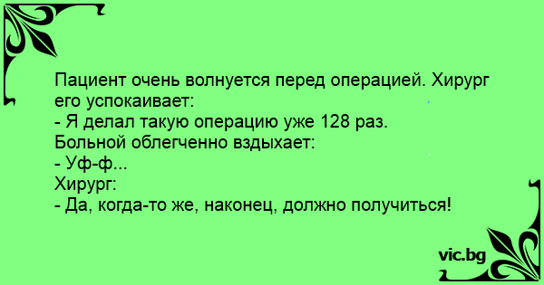 Пациент очень волнуется перед операцией. Хирург его успокаивает: