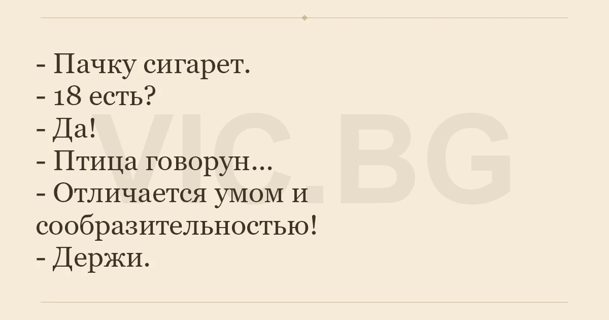- Пачку сигарет. - 18 есть? - Да! - Птица говорун... - Отличается умом и сообразительностью! - Держи.