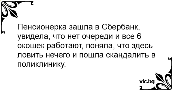 Пенсионерка зашла в Сбербанк, увидела, что нет очереди и все 6 окошек работают, поняла, что здесь ловить нечего и пошла скандалить в поликлинику.