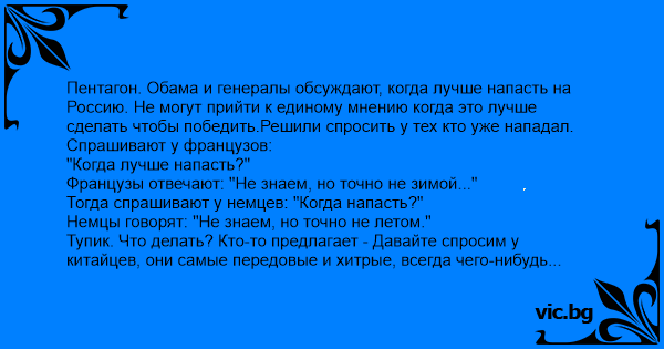 Пентагон. Обама и генералы обсуждают, когда лучше напасть на Россию. Не могут прийти к единому мнению когда это лучше сделать чтобы победить.Решили спросить у тех кто уже нападал. Спрашивают у французов: