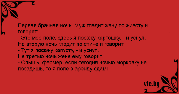 In noaptea nuntii, sotul mangaie burta sotiei si apoi zice duios: - Acesta este domeniul meu, aici am sa sadesc cartofi. Si a adormit. A doua noapte la fel, o mangaie si ii spune mieros: - Aici voi...