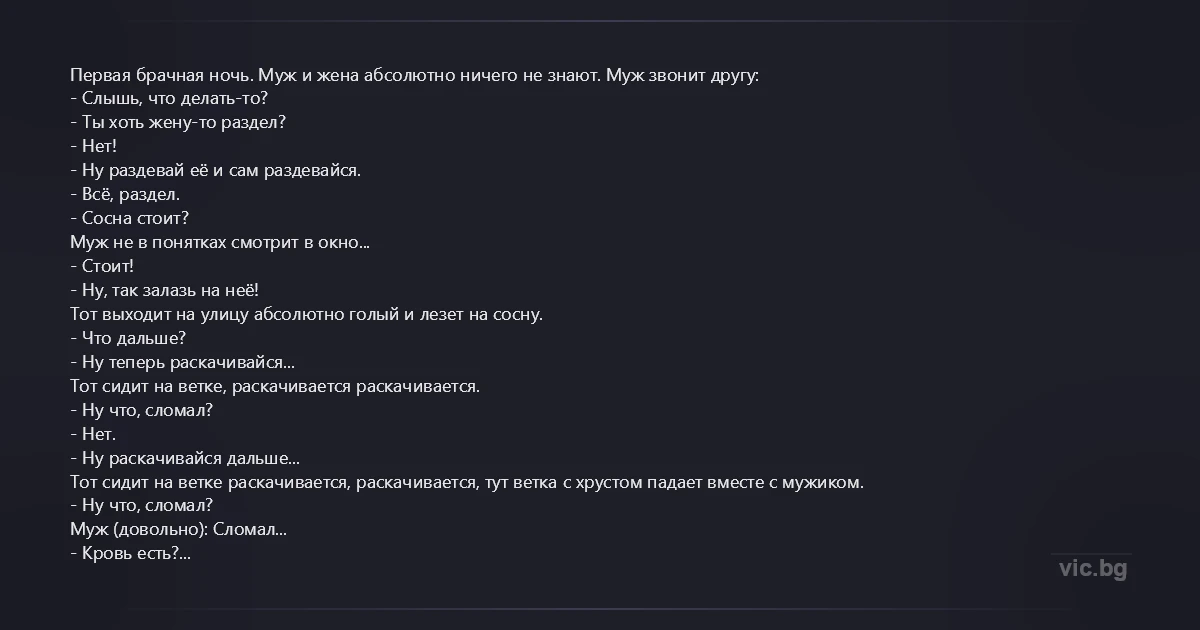 Первая брачная ночь. Муж и жена абсолютно ничего не знают. Муж звонит другу: