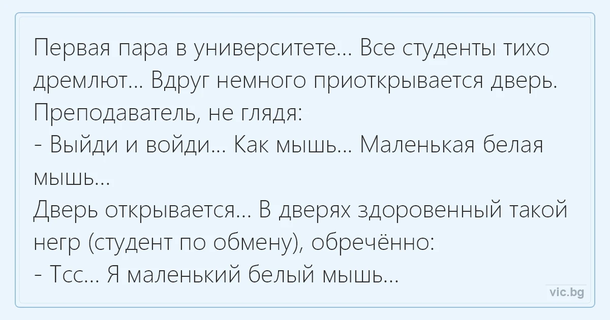 Первая пара в университете... Все студенты тихо дремлют... Вдруг немного приоткрывается дверь. Преподаватель, не глядя: - Выйди и войди... Как мышь... Маленькая белая мышь... Дверь открывается... В дверях здоровенный такой нeгp (студент по обмену), обречённо: - Тсс... Я маленький белый мышь...
