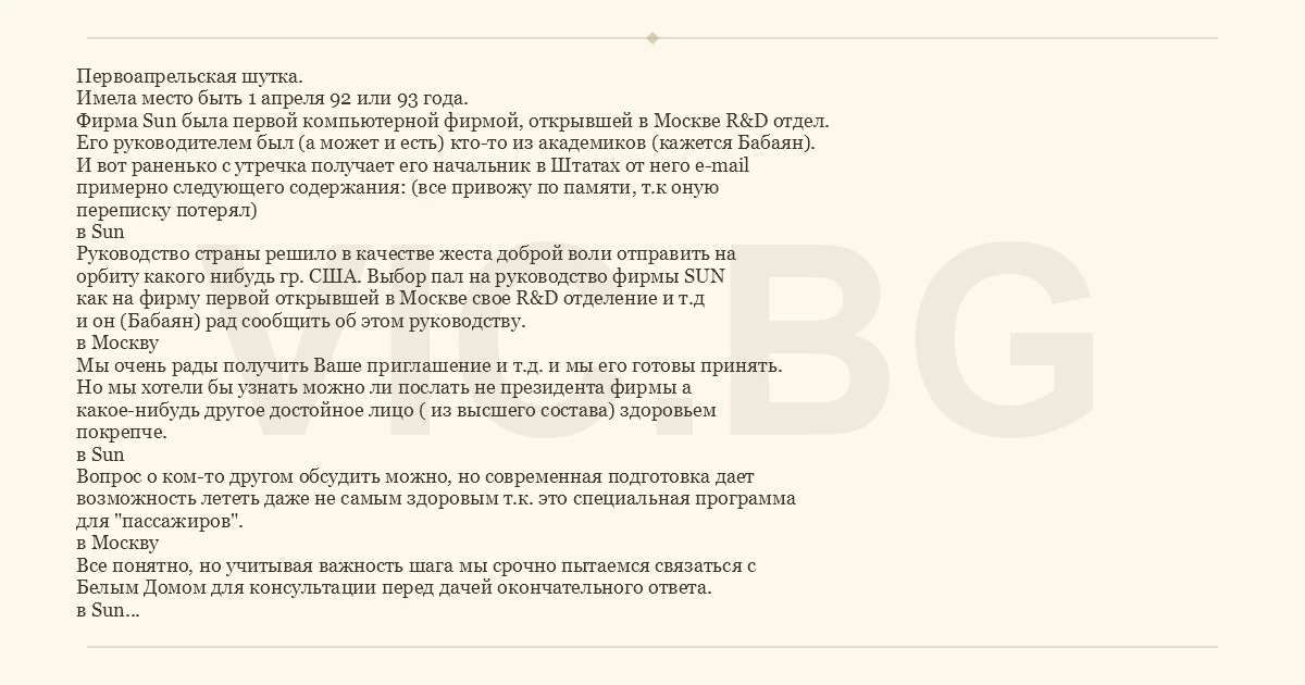 Первоапрельская шутка. Имела место быть 1 апреля 92 или 93 года. Фирма Sun была первой компьютерной фирмой, открывшей в Москве R&D отдел. Его руководителем был (а может и есть) кто-то из академиков (кажется Бабаян). И вот раненько с утречка получает его начальник в Штатах от него е-mail примерно следующего содержания: (все привожу по памяти, т.к оную переписку потерял) в Sun Руководство страны решило в качестве жеста доброй воли отправить на орбиту какого нибудь гр. США. Выбор пал на руководство фирмы SUN как на фирму первой открывшей в Москве свое R&D отделение и т.д и он (Бабаян) рад сообщить об этом руководству. в Москву Мы очень рады получить Ваше приглашение и т.д. и мы его готовы принять. Но мы хотели бы узнать можно ли послать не президента фирмы а какое-нибудь другое достойное лицо ( из высшего состава) здоровьем покрепче. в Sun Вопрос о ком-то другом обсудить можно, но современная подготовка дает возможность лететь даже не самым здоровым т.к. это специальная программа для "пассажиров". в Москву Все понятно, но учитывая важность шага мы срочно пытаемся связаться с Белым Домом для консультации перед дачей окончательного ответа. в Sun С 1-ым Апреля дорогие граждане. --------------------------------------------- По датам на mail переписка заняла несколько часов. Какой выдержкой надо обладать, чтобы не расколоться раньше (Москве), и каким чувством юмора, чтоб потом запустить это в сеть (Sun)! Так как история 100% реальная, приношу извинения за неточности.