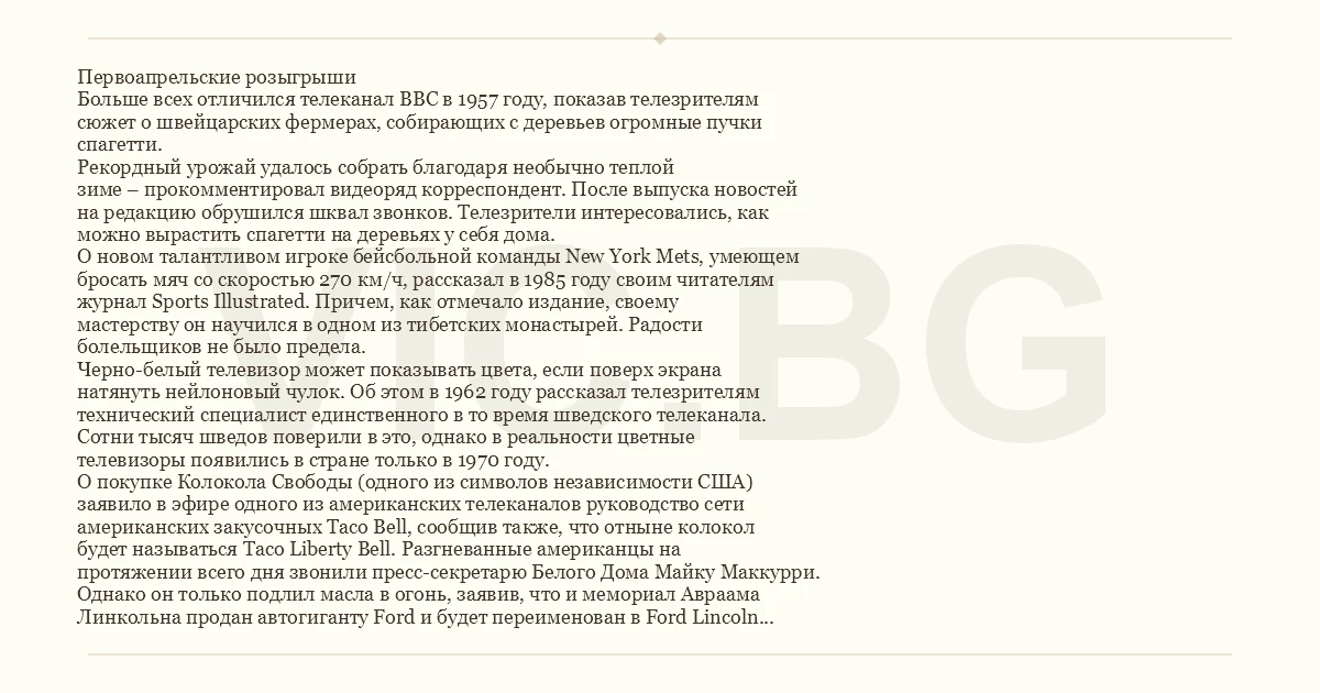 Первоапрельские розыгрыши Больше всех отличился телеканал BBC в 1957 году, показав телезрителям сюжет о швейцарских фермерах, собирающих с деревьев огромные пучки спагетти. Рекордный урожай удалось собрать благодаря необычно теплой зиме – прокомментировал видеоряд корреспондент. После выпуска новостей на редакцию обрушился шквал звонков. Телезрители интересовались, как можно вырастить спагетти на деревьях у себя дома. О новом талантливом игроке бейсбольной команды New York Mets, умеющем бросать мяч со скоростью 270 км/ч, рассказал в 1985 году своим читателям журнал Sports Illustrated. Причем, как отмечало издание, своему мастерству он научился в одном из тибетских монастырей. Радости болельщиков не было предела. Черно-белый телевизор может показывать цвета, если поверх экрана натянуть нейлоновый чулок. Об этом в 1962 году рассказал телезрителям технический специалист единственного в то время шведского телеканала. Сотни тысяч шведов поверили в это, однако в реальности цветные телевизоры появились в стране только в 1970 году. О покупке Колокола Свободы (одного из символов независимости США) заявило в эфире одного из американских телеканалов руководство сети американских закусочных Taco Веll, сообщив также, что отныне колокол будет называться Taco Liberty Веll. Разгневанные американцы на протяжении всего дня звонили пресс-секретарю Белого Дома Майку Маккурри. Однако он только подлил масла в огонь, заявив, что и мемориал Авраама Линкольна продан автогиганту Ford и будет переименован в Ford Lincoln Mercury Memorial. Британская газета The Guardian прикольнулась над своими читателями, выпустив в 1977 году семистраничное приложение о несуществующем государстве San Serriffe, расположенном в Индийском океане. Эта чудесная страна состояла из двух островов. Один из них имел форму точки, другой – запятой. National Public Radio объявило в 1992 году о том, что Ричард Никсон снова намерен избираться на пост президента. Лозунг его избирательной кампании звучал так: "Я не допустил ни одной ошибки, и не допущу их впредь". Американцы возмутились, так как Ричард Никсон уже был президентом США два срока подряд. Власти американского штата Алабама постебались над читателями журнала New Mexicans for Science and Reason в 1998 году, сообщив, что они собираются изменить значение числа "Пи" с 3,14159... на 3,0. Чиновники посчитали нынешнее значение этого числа "нехристианским" и решили округлить его до "библейского значения". Новость мгновенно распространилась через интернет по всему миру. В журнале USA Today в том же году сеть закусочных Burger King разместила объявление, что специально для 32 млн американских левшей они начали выпускать новый вид гамбургеров. Тысячи американских левшей позвонили руководству компании с просьбой сделать специальные гамбургеры и для правшей, дабы избежать дискриминации. Неизвестных науке червей обнаружил итальянский биолог Април Паццо в Антарктиде. Об этом сообщил в 1985 году своим читателям журнал Discover. На головах червей, по словам ученого, располагались костяные пластины, которые нагревались до высокой температуры и позволяли червям передвигаться подо льдом на большой скорости. Черви охотились на пингвинов и были причастны к таинственному исчезновению исследователя Антарктиды Филиппа Пуассона в 1837 году. Британский астроном Патрик Мур в выпуске радионовостей в 1976 году заявил, что около десяти утра следующего д