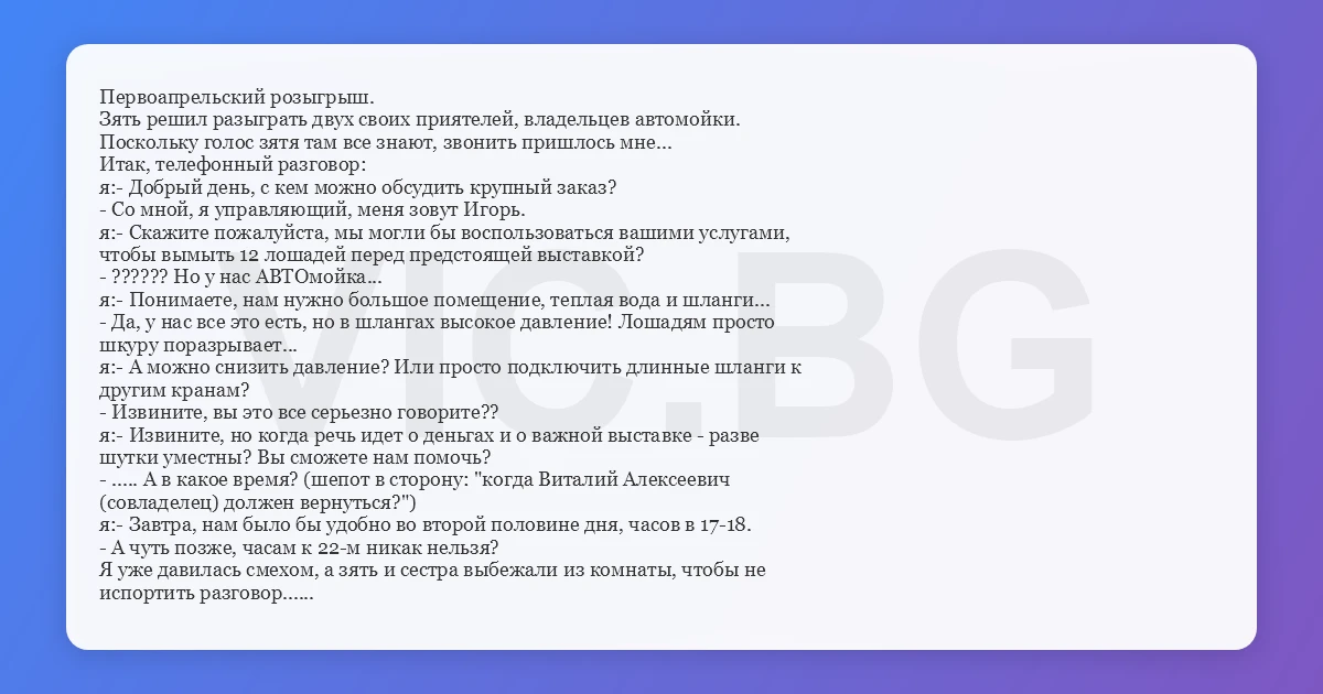 Первоапрельский розыгрыш. Зять решил разыграть двух своих приятелей, владельцев автомойки. Поскольку голос зятя там все знают, звонить пришлось мне... Итак, телефонный разговор: я:- Добрый день, с кем можно обсудить крупный заказ? - Со мной, я управляющий, меня зовут Игорь. я:- Скажите пожалуйста, мы могли бы воспользоваться вашими услугами, чтобы вымыть 12 лошадей перед предстоящей выставкой? - ?????? Но у нас АВТОмойка... я:- Понимаете, нам нужно большое помещение, теплая вода и шланги... - Да, у нас все это есть, но в шлангах высокое давление! Лошадям просто шкуру поразрывает... я:- А можно снизить давление? Или просто подключить длинные шланги к другим кранам? - Извините, вы это все серьезно говорите?? я:- Извините, но когда речь идет о деньгах и о важной выставке - разве шутки уместны? Вы сможете нам помочь? - ..... А в какое время? (шепот в сторону: "когда Виталий Алексеевич (совладелец) должен вернуться?") я:- Завтра, нам было бы удобно во второй половине дня, часов в 17-18. - А чуть позже, часам к 22-м никак нельзя? Я уже давилась смехом, а зять и сестра выбежали из комнаты, чтобы не испортить разговор... я:- Боитесь, что мы распугаем клиентов? Хорошо, мы подъедем позже... Нам главное - вымыть лошадей и знать, что вы нам поможете... - А как вы платить думаете? я:- По перечислению. - Ой, у нас ЧП, чеки... я:- Это сложнее... Но если вы поможете, о цене, думаю мы сможем договориться... - .............. я:- Я слышу, вы сомневаетесь... Может быть, вы поговорите с директором? - Наверное, так и сделаем... Перезвоните через 1,5 часа... я:- А можно я оставлю свой номер, вдруг ваш директор еще не приедет? А вы примете решение и перезвоните... - Договорились! (Телефон был записан) Зять не смог ждать два часа. Через час он перезвонил Виталию Алексеевичу и спросил, нельзя ли у них помыть бегемота... На что Виталий Алексеевич матюкнулся и сказал, что мастера уже полчаса экспериментируют с понижением давления в шлангах... Тали