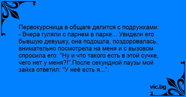 - Вчера гуляли с парнем в парке... Увидели его бывшую девушку, она подошла, поздоровалась, внимательно посмотрела на меня и с вызовом спросила его: "Ну и что такого есть в этой сучке, чего нет у меня?!".После секундной паузы мой зайка ответил: "У неё есть я...".