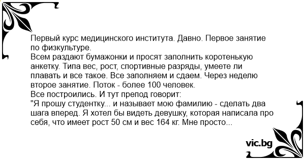 "Я прошу студентку... и называет мою фамилию - сделать два шага вперед. Я хотел бы видеть девушку, которая написала про себя, что имеет рост 50 см и вес 164 кг. Мне просто интересно посмотреть на эту шайбу. Ее же легче перепрыгнуть, чем обойти.