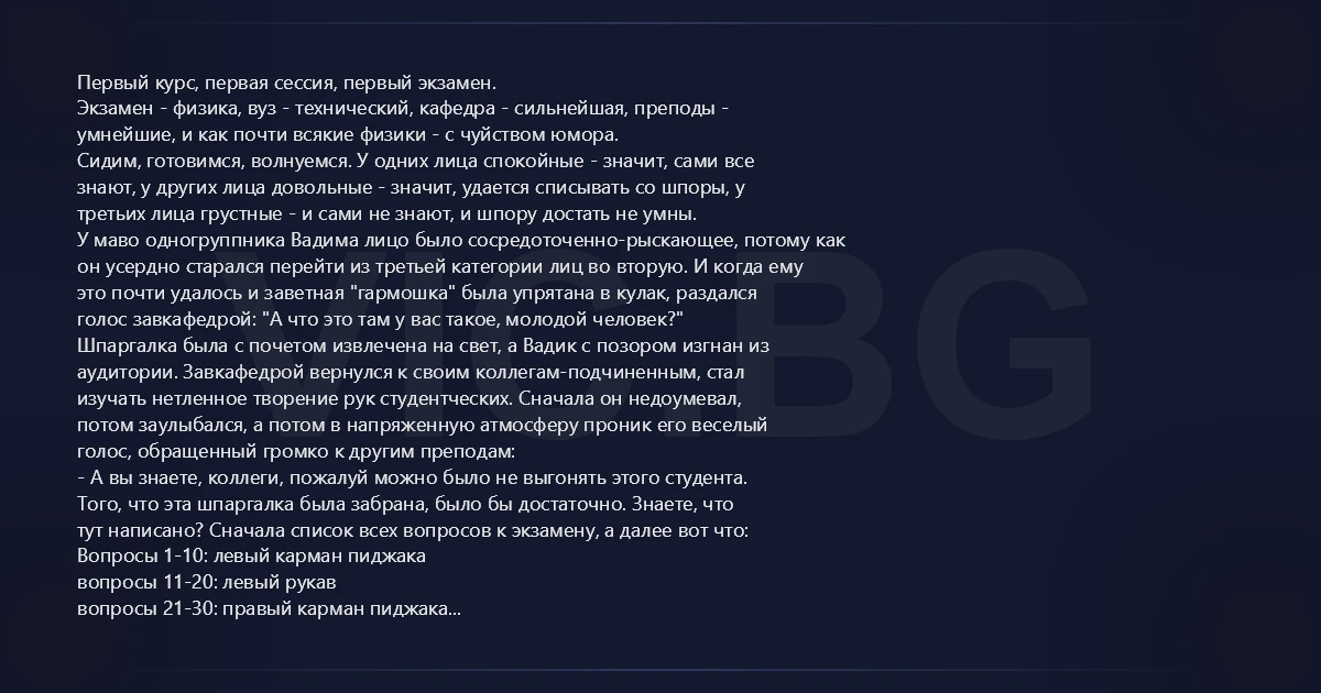 Первый курс, первая сессия, первый экзамен. Экзамен - физика, вуз - технический, кафедра - сильнейшая, преподы - умнейшие, и как почти всякие физики - с чуйством юмора. Сидим, готовимся, волнуемся. У одних лица спокойные - значит, сами все знают, у других лица довольные - значит, удается списывать со шпоры, у третьих лица грустные - и сами не знают, и шпору достать не умны. У маво одногруппника Вадима лицо было сосредоточенно-рыскающее, потому как он усердно старался перейти из третьей категории лиц во вторую. И когда ему это почти удалось и заветная "гармошка" была упрятана в кулак, раздался голос завкафедрой: "А что это там у вас такое, молодой человек?" Шпаргалка была с почетом извлечена на свет, а Вадик с позором изгнан из аудитории. Завкафедрой вернулся к своим коллегам-подчиненным, стал изучать нетленное творение рук студентческих. Сначала он недоумевал, потом заулыбался, а потом в напряженную атмосферу проник его веселый голос, обращенный громко к другим преподам: - А вы знаете, коллеги, пожалуй можно было не выгонять этого студента. Того, что эта шпаргалка была забрана, было бы достаточно. Знаете, что тут написано? Сначала список всех вопросов к экзамену, а далее вот что: Вопросы 1-10: левый карман пиджака вопросы 11-20: левый рукав вопросы 21-30: правый карман пиджака вопросы 31-40: правый рукав вопросы 41-50: левый внутренний карман вопросы 51-60: под левым карманом вопросы 61-65: правый внутренний карман вопросы 66-70: под правым карманом. А воспользоваться этим указателем,коллеги, из-за меня он не успел. Да, зря я его выгнал. P.S. (грустный): Вадик все-таки вылетел на этой сессии, а для меня это был первый и единственный экзамен, который мне пришлось пересдавать.