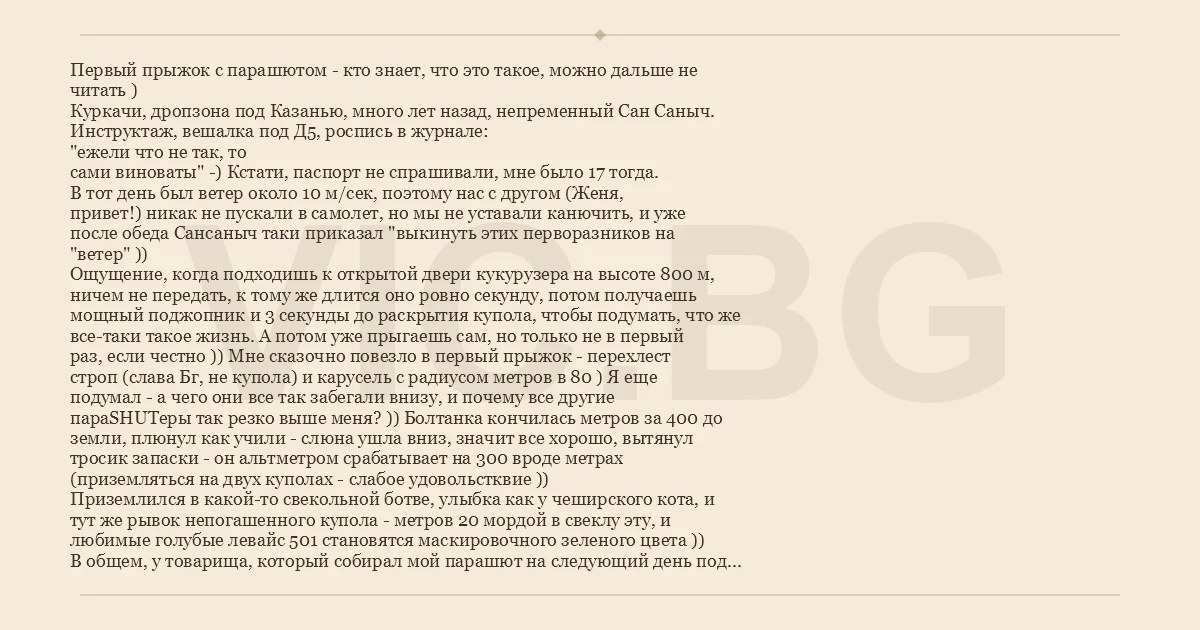 Первый прыжок с парашютом - кто знает, что это такое, можно дальше не читать ) Куркачи, дропзона под Казанью, много лет назад, непременный Сан Саныч. Инструктаж, вешалка под Д5, роспись в журнале: "ежели что не так, то сами виноваты" -) Кстати, паспорт не спрашивали, мне было 17 тогда. В тот день был ветер около 10 м/сек, поэтому нас с другом (Женя, привет!) никак не пускали в самолет, но мы не уставали канючить, и уже после обеда Сансаныч таки приказал "выкинуть этих перворазников на "ветер" )) Ощущение, когда подходишь к открытой двери кукурузера на высоте 800 м, ничем не передать, к тому же длится оно ровно секунду, потом получаешь мощный поджопник и 3 секунды до раскрытия купола, чтобы подумать, что же все-таки такое жизнь. А потом уже прыгаешь сам, но только не в первый раз, если честно )) Мне сказочно повезло в первый прыжок - перехлест строп (слава Бг, не купола) и карусель с радиусом метров в 80 ) Я еще подумал - а чего они все так забегали внизу, и почему все другие параSHUTеры так резко выше меня? )) Болтанка кончилась метров за 400 до земли, плюнул как учили - слюна ушла вниз, значит все хорошо, вытянул тросик запаски - он альтметром срабатывает на 300 вроде метрах (приземляться на двух куполах - слабое удовольстквие )) Приземлился в какой-то свекольной ботве, улыбка как у чеширского кота, и тут же рывок непогашенного купола - метров 20 мордой в свеклу эту, и любимые голубые левайс 501 становятся маскировочного зеленого цвета )) В общем, у товарища, который собирал мой парашют на следующий день под левым глазом была синяя такая слива )) А со мной тогда выпили даже мальчишки из летного звена ДОСААФ, и потом как-то покатали в день авиации на вертолете спортивном, но это уже совсем другая история.