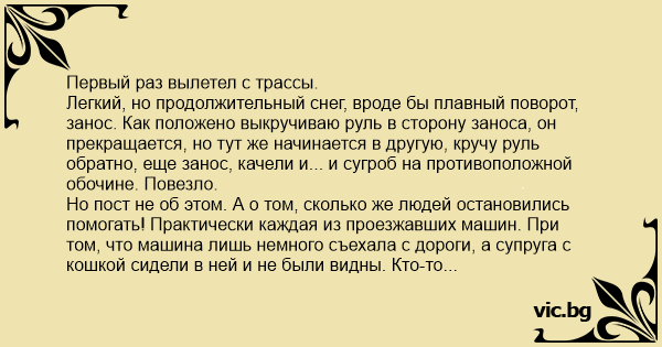 Первый раз вылетел с трассы. Легкий, но продолжительный снег, вроде бы плавный поворот, занос. Как положено выкручиваю руль в сторону заноса, он прекращается, но тут же начинается в другую, кручу руль обратно, еще занос, качели и... и сугроб на противоположной обочине. Повезло. Но пост не об этом. А о том, сколько же людей остановились помогать! Практически каждая из проезжавших машин. При том, что машина лишь немного съехала с дороги, а супруга с кошкой сидели в ней и не были видны. Кто-то по своей инициативе съездил к ближайшему трактору. Женщина-таксист подарила трос взамен порвавшегося. Несколько джиперов пытались вытащить своими машинами. Наконец апофеозом стал проезжавший мимо эвакуатор, которой остановился, таки вытащил машину с обочины, и не взял за это денег!! Поэтому вранье, что люди у нас злые и эгоистичные. Да, если в толпе человек падает в обморок, то большинство мнутся и тормозят - потому что не знают, что надо делать, и не будет ли их вызов скорой повторным или ложным. Но люди у нас реально готовы помогать. Для нас с супругой это самое большое впечатление от поездки, куда большее, чем сама авария... Basil/2
