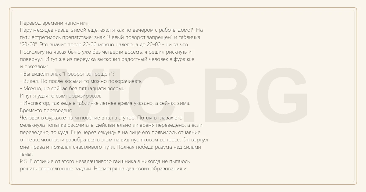 - Инспектор, так ведь в табличке летнее время указано, а сейчас зима.