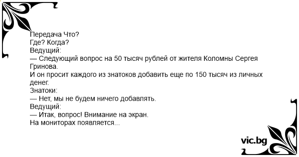 — Следующий вопрос на 50 тысяч рублей от жителя Коломны Сергея Гринова.