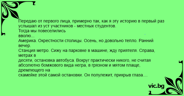 услышал из уст участников - местных студентов. Тогда мы повеселились вволю... Америка. Окрестности столицы. Осень, но довольно тепло. Ранний вечер. Станция метро. Сижу на парковке в машине, жду приятеля. Справа, метрах в десяти, остановка автобуса. Вокруг практически никого, не считая абсолютно бомжового вида негра, в грязном и мятом плаще, дремлющего на скамейке этой самой остановки. Он полулежит, прикрыв глаза. Из-под замызганной типически-негритянской вязаной шапки видны наушники. Музыку слушает, видать. Небось, реп свой дурацкий. Курю, открыв окна. Тоже слушаю музыку - Б.Г. Регулятор громкости на минимуме. Появляется приятель, плюхается на сиденье, слышит свою любимую песню "Рок-Н-Ролл Мертв" и врубает звук на полную. Я как раз повернулся в его сторону, поэтому начало последующего действа и произошло у меня на глазах, повергнув в полный ступор. Угнетенного белыми расистами афроамериканца прям подбросило в воздух, он оскалил белозубую улыбку во всю ширь, заорал, перекрывая рев моей магнитолки: "Братьяаааааааа!" и ринулся прямо к нам. Я не сразу въехал, что кричит-то он по-русски, и первым порывом было дать с места по газам. Не успел я коснуться ручника, как эта черная образина, оказавшаяся ростом никак не меньше небезызвесного баскетболиста О`Нила, уже просунулась в окно машины, хватая нас за руки и причитая скороговоркой безо всякого акцента: "Друзья, как я рад, что вас встретил наконец, моченьки моей больше нет, где ж вы были-то, че ж меня бросили, я ж тут чуть не помер, ну как вам, б%я, не стыдно так над соотечественником издеваться, ну е# вашу мать?!". Представляете наше полуобморочное состояние??? Мы как сидели с раскрытыми ртами и выпученными глазами, так и застыли. Я только и смог, что протянуть руку и удавить в ноль последние завывы ляпинской гитары. А наш новый загорелый друг так и продолжал нависать над нами, грозя оторвать мне дверцу, не уставая тараторить: "...Вы не представляете, что мне тут только не довелось пережить. Обокрали, чуть в полицию дважды не попал, подрался, ночевал в церкви, потом в приюте, чуть на какую-то оккультную тусовку не затащили, выучил кучу новых английских слов, потерял книжку с телефонами-адресами и словарь вместе с сумкой, бумажником и деньгами, хорошо хоть паспорт и плеер остались, люди добрые вот шапочку подарили..." Приятель мой очнулся чуть раньше меня и попытался внести ясность: - А ты, собственно, хто? Лицо негритянской национальности отразило разом целую гамму чувств от мысленного напряжения до полного удивления. - Как кто? Серега я, из Москвы. Вы че меня не встретили запозавчера, гады? Ситуация... Тут мы задумались. Вид черного бомжа, утверждающего на чистокровном рассейском диалекте, что он какой-то известный нам Серега из Москвы, которого зачем-то надо было встречать не сегодня, а именно запозавчера, внушил нам подозрение о групповом психозе на почве круглосуточного кнопкотоптательства. Мы переглянулись. - Да что вы, мужики, ей богу? Допились до того, что числа путаете? Я ж двенадцатого еще прилетел в ваш долбаный Балтимор-Вашингтон Аэропорт с пересадки в Нью-Йорке. Макс сказал, что вы меня от метро заберете. Я тут как дуpak 4 часа прокуковал... Пошел в туалет на заправку и сумку оставил на минуту, вернулся нету... Каждый день теперь тут торчу, жду вас... Этож пи#дец прям какой-то! Чуть не поседел весь... Тут до нас начало м