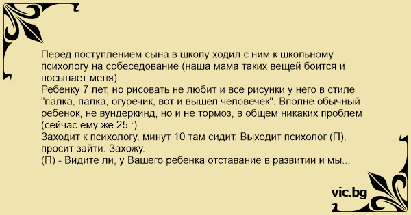 - Вы его запишите в обычный класс, он нормальный, просто рисовать не любит. - В общем, предупреждая меня, что ему будет тяжело учиться в таком классе, она скрепя сердце вписала сына в обычный класс.