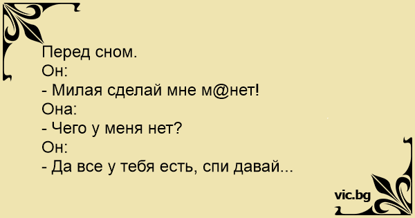 Перед сном.<br />Он:<br />- Милая сделай мне м@нет!<br />Она:<br />- Чего у меня нет?<br />Он:<br />- Да все у тебя есть, спи давай...