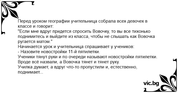 Училка думает, а вдруг что-то пропустили и, естественно, поднимает Вовочку.