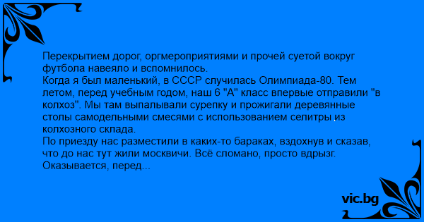 Когда я был маленький, в СССР случилась Олимпиада-80. Тем летом, перед учебным годом, наш 6 "А" класс впервые отправили "в колхоз". Мы там выпалывали сурепку и прожигали деревянные столы самодельными смесями с использованием селитры из колхозного склада.