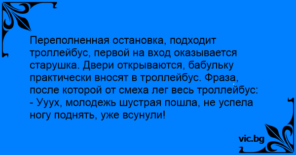 Переполненная остановка, подходит троллейбус, первой на вход оказывается старушка. Двери открываются, бабульку практически вносят в троллейбус. Фраза, после которой от смеха лег весь троллейбус: