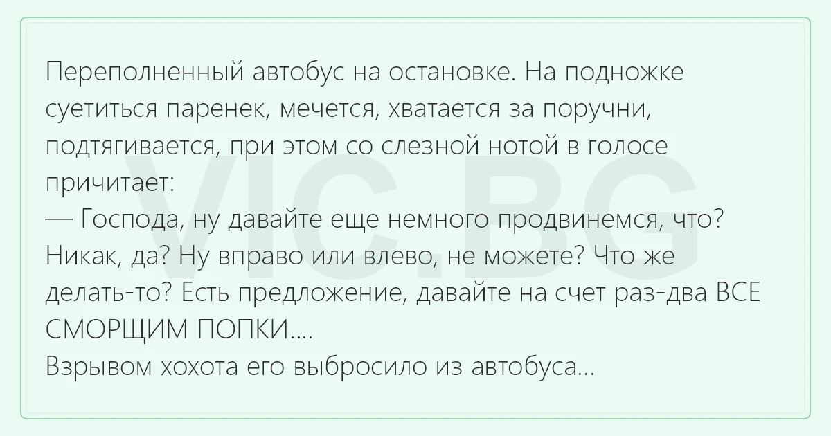 Переполненный автобус на остановке. На подножке суетиться паренек, мечется, хватается за поручни, подтягивается, при этом со слезной нотой в голосе причитает: — Господа, ну давайте еще немного продвинемся, что? Никак, да? Ну вправо или влево, не можете? Что же делать-то? Есть предложение, давайте на счет раз-два ВСЕ СМОРЩИМ ПОПКИ.... Взрывом хохота его выбросило из автобуса…