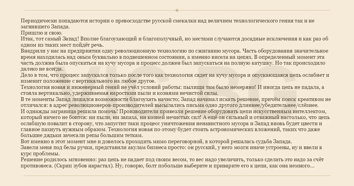 Периодически попадаются истории о превосходстве русской смекалки над величием технологического гения так и не загнившего Запада. Пришлю и свою. Итак, тот самый Запад! Вполне благоухающий и благополучный, но местами случаются досадные исключения и как раз об одном из таких мест пойдёт речь. Внедрили у нас на предприятии одну революционную технологию по сжиганию мусора. Часть оборудования значительное время находилась над оным буквально в подвешенном состоянии, а именно висела на цепях. В определенный момент эта часть должна была опускаться на кучу мусора и процесс должен был запускаться на полную катушку. Но так происходило далеко не всегда. Дело в том, что процесс запускался только после того как технология сядет на кучу мусора и опускающаяся цепь ослабнет и изменит положение с вертикального на любое другое. Технология новая и инженерный гений не учёл условий работы: пылищи там было немеряно! И иногда цепь не падала, а стояла вертикально, удерживаемая наростами пыли и кознями нечистой силы. В те моменты Запад лишался возможности благоухать начисто; Запад начинал искать решение, причём поиск креативом не отличался: в адрес революционеров-производителей высылались письма одно другого длиннее/убедительнее/слёзнее. И однажды заграница решила помочь! Производители привезли решение оборудовать цепи искусственным интеллектом, который ничего не боится: ни пыли, ни запаха, ни козней нечистых сил! А ещё он сильный и отважный настолько, что цепь ослабшую повалит в сторону, что запустит таки процесс уничтожения ненавистного мусора и Запад вновь будет цвести и главное пахнуть нужным образом. Технология новая по-этому будет стоить астрономических вложений, таких что даже большие дядьки зачесали репы большим теткам. Вот именно в этот момент мне и довелось проходить мимо переговорной, в которой решалась судьба Запада. Завели меня под белы ручки, представили акулам бизнеса просто: он русский, у него мозги иначе устроены, ну и ввели в курс проблемы. Решение родилось мгновенно: раз цепь не падает под своим весом, то вес надо увеличить, только сделать это надо за счёт противовеса. (Скрип зубов нарастал). Ну, говорю, болт побольше выберите и приварите его к цепи, как она немного ослабнет - он вам ее повалит. Сказал и уехал. Было это лет 5 назад, ребята говорят, что мой болт до сих пор работает исправно на нужды Запада, а вот цепь с искусственным интеллектом так мир и не увидел. Впрочем, так миру и надо, а то не только гаджеты умнее людей будут, но и цепи.