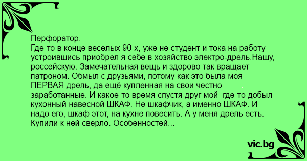Где-то в конце весёлых 90-х, уже не студент и тока на работу устроившись приобрел я себе в хозяйство электро-дрель.Нашу, россейскую. Замечательная вещь и здорово так вращает патроном. Обмыл с друзьями, потому как это была моя ПЕРВАЯ дрель, да ещё купленная на свои честно заработанные. И какое-то время спустя друг мой где-то добыл кухонный навесной ШКАФ. Не шкафчик, а именно ШКАФ. И надо его, шкаф этот, на кухне повесить. А у меня дрель есть. Купили к ней сверло. Особенностей сверления кирпичных-бетонных стен никто из нас не знал, но все друзья почему-то решили, что знания приобретаются вместе с дрелью. Поэтому сверло было куплено обычное, для сверления металла. Чтобы рука мастера не дрожала, были оприходованы первые грамм по 50. Отметки промеряны и проставлены. Началось само действо. Фигня! Дом-то кирпичный! Плёвое дело! Завывая и вереща, сверло лихо прошло свой первый сантиметр и встало. Всё так же вереща. Оно перегрелось и конец его даже не притупился, оплавился. Почёсывая затылки и хмуря лбы, приняли ещё для ясности и пошли к товарищу, отец которого работал в ЖЭК-е. Тот ржать не стал, а прояснил, что дырявить стены надо ПЕРФОРАТОРОМ и спецсвёрлами. И что у него как раз есть такой. И дал нам его. Этот перфоратор тоже был построен в СССР, и построен (нет-нет, не сделан, а именно построен!) на совесть и на века. Размером он был с шахтёрский отбойный молоток, вес не меньший. И было с ним сверло. Диаметром с большой палец руки. И длиной около 80 см. Что нас не смутило - хepня, деревяный чопик можно хоть с полено выстругать, главное - дыра, куда его вбить. Остальное приложится. Пока несли агрегат в спортивной сумке, народ на нас как-то косился. Года 90-е. Маленький городок. Сверло из сумки торчит, но скромно тряпочкой обмотано. Чисто ствол. Принесли аппарат, воткнули в розетку, обмыли и я приступил. Помня усилие, приложенное к первому сантиметру, упёрся, закогтился и навалился всей тушкой. Через секунду я с маху врезался в стену, а с той стороны послышался нехороший грохот. Потом рык, в котором угадывалось-БЛЯЯЯЯ!Вытащил сверло и стал вглядываться в проделанную скважину. Она была какого-то невероятного размера, а увидеть что творится на той стороне мешала неосевшая пыль. В пыли что-то шевелилось. Я дунул, в ответ раздался рёв ещё большей силы. Оторваться от дыры я не мог. Через несколько секунд с той стороны показался налитый кровью глаз. Выражение его меня почему-то не успокоило. Пыль ещё не осела, глаз было видно плохо и я машинально дунул снова....Стены задрожали, глаз исчез. Запахло пиздюлинами. Пркинув время появления соседа, живущего в соседнем подъезде (4-й этаж) решил, что раз скандала не избежать, то одной дырой больше, одной меньше... Агрегат взревел, меня втянуло за сверлом. Раздался ожидаемый грохот и что-то печально зазвенело... Наступила тишина, которую вскоре заполнил гул на лестнице. Там явно поднималось стадо бизонов. Гул притих в районе нашего этажа. Секунду-другую стадо ориентировалось на местности, наводилось и ... попыталось вынести нашу металлическую дверь.