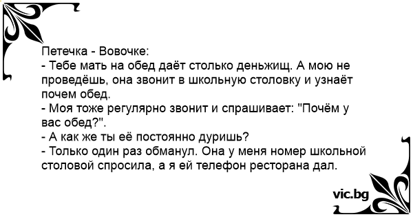 - Тебе мать на обед даёт столько деньжищ. А мою не проведёшь, она звонит в школьную столовку и узнаёт почем обед.